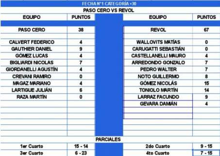 En el segundo turno de la primera fecha de la categoría +30 del Torneo de Verano de Campana, Revol derrotó 67-38 a Paso Cero. Nicolás Gómez (15) y Martín "el Loco" Toniolo (14) fueron los principales artífices del triunfo del Revoltijo.
