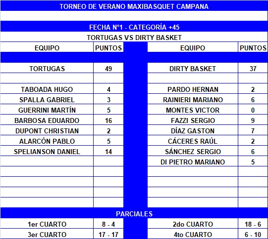 Tortugas se impuso 49-37 a Dirty Boys, en el partido inaugural de la categoría +45 del Torneo de Verano de Campana. Los máximos anotadores de los anfibios fueron Eduardo Barboza (16) y Daniel Spellanzon (14). Sergio Fazzi (9) fue el mejor de los chicos duros.