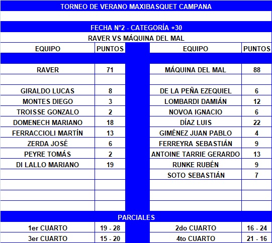 Ante un rival que supo oponerle más resistencia que en el comienzo del certamen, los Maléficos llevaron las riendas del partido y construyeron el triunfo cuarto a cuarto. A falta de 10 por jugar, el marcador de 72-50 daba por sentenciado el partido. Fue entonces que los de Cardales pudieron descontar un poco, para maquillar el resultado final.