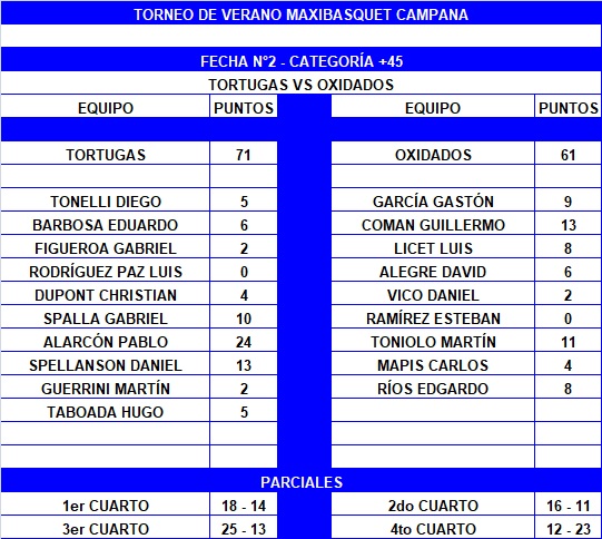 En la despedida de Gabriel "el Pela" Figueroa (2), Tortugas derrotó 71-61 a Oxidados, por la fecha 2 de la categoría +45 del Torneo de Verano de Campana. Pablo Alarcón (24) le hizo honor a su amigo y fue la figura del vencedor. Oxidados contó con Guillermo "Memo" Coman (13) y Martín "el Loco" Toniolo (11) como principales cartas de gol.