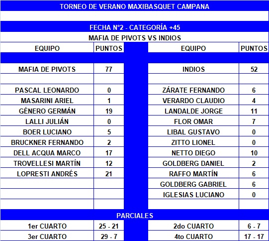 La Mafia acabó con la buena estrella de Los Indios de Moreno en el Torneo +45 de Verano de Campana. El conjunto naranja se impuso 77-52 ante el Negriblanco, por la fecha 2. Luego de un comienzo impreciso, Andrés "Andy" Lopresti (21) se contituyó en goleador del ganador, junto a Germán Género (19) y Marco Dell Acqua (17). En la Tribu se destacaron Jorge Landalde (11) y Diego Netto (10).