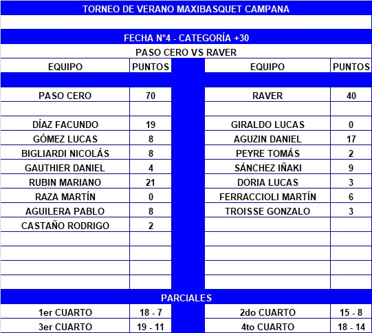Paso Cero sigue como escolta en el maxi +30 de Campana, luego de superar a paso firme a Raver. De arranque, la dupla Rubin-Díaz marco la cancha. Los triples del primero y los dobles del segundo impusieron un parcial de 18-7, haciendo estéril el esfuerzo de Aguzin e Iñaki Sánchez (9) para los de Exaltación de la Cruz. En la segunda manga se dio la misma tónica: Buen cierre de Lucas Gómez (8), apoyando otro cuarto brillante de Rubin. Raver repartió goleo y no pudo acompañar el ritmo de su rival, que se fue al vestuario ganando 33-15.