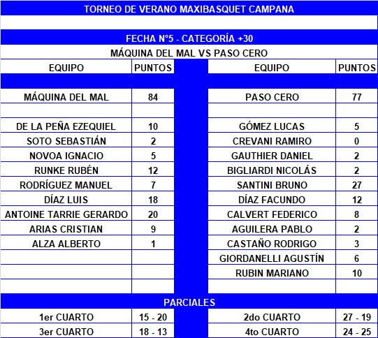 Máquína del Mal se impuso 84-77 a Paso Cero, por la quinta fecha del Torneo +30 de Verano en Campana. Gerardo Antoine Tarrie (20) y Luis Díaz (18) fueron los goleadores del ganador. Bruno Santini (27) fue la figura del perdedor y del partido.