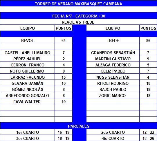 Trede venció 86-64 a Revol y concluyó en el primer lugar de la tabla del Torneo +30 de Verano en Campana. Tridente goleador en el ganador: Pablo Rajch (19), un culto a regularidad, Rodrigo Ritoli (18) imparable en el último cuarto, y Marko Zoric (18) la referencia en el poste bajo. Facundo Larraz (15) sacó la cara por el Revoltijo.