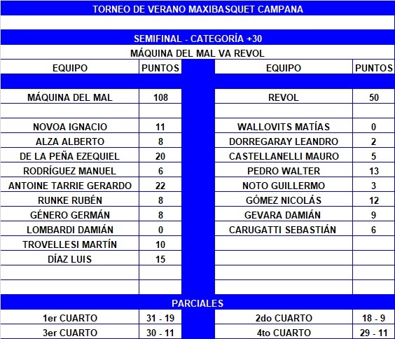 Máquina del Mal se consagró finalista del Torneo +30 de Verano en Campana, al vencer 108-50 a Revol. Gerardo Antoine Tarrie (22) y Ezequiel De la Peña (20) fueron los líderes anotadores de los maléficos. Walter Pedro (13) y Nicolás Gómez (12) se apuntaron en el goleo del Revoltijo.