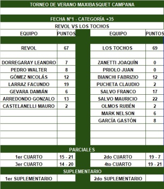 Los Tochos debutaron con un agónico triunfo 69-67 sobre Revol, en la continuidad de la fecha 1 del Torneo de Maxibásquet +35 que se disputa en el Club Ciudad de Campana. La larga distancia de Mauricio (22) y Franco Salvo (17) fueron claves para los siderúrgicos. Facundo Larraz (19) del Revoltijo.