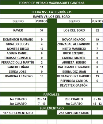 Victoria 62-57 de Los del Sgro ante Raver, por la segunda fecha del Torneo de Maxibásquet +35 de Campana. Ignacio Novoa y Gabriel Bantancourt, con 19 puntos cada uno, fueron los artífices del triunfo del equipo que entrena en el gimnasio dos del Club Ciudad Campana. Iñaki Sánchez (14) fue el goleador del Cardo.