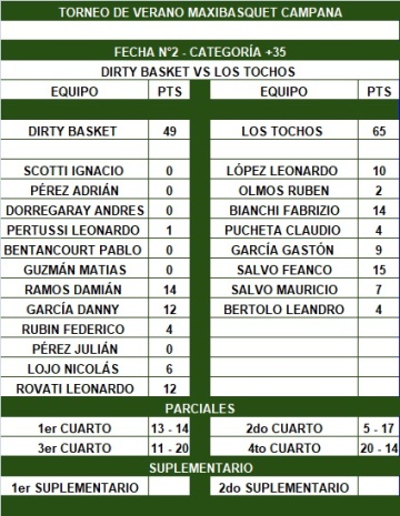 Por la segunda fecha del Torneo de Maxibásquet +35 de Verano en Campana, Los Tochos vencieron 65-49 a Dirty Básket. Franco Salvo (15) y Fabrizio Bianchi (14) golearon para el ganador. Damián Ramos (14), acompañado por Danny García y Leonardo "el Gringo" Rovati (ambos con 12 unidades) fueron los destacados del conjunto blanco.