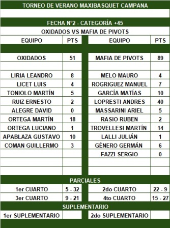 En el arranque de su defensa del título, Mafia de Pivots no tuvo indulgencia con Oxidados, y lo superó 89-51, en juego correspondiente a la fecha 2 del Torneo de Maxibásquet +45 de Verano en Campana. Andrés "Andy" Lopresti anotó 40 puntos para los del bajo mundo. Martín Ortega hizo 18 para los zarateños, que en el primer tiempo la pelearon cuando pudieron, pero luego fueron superados.