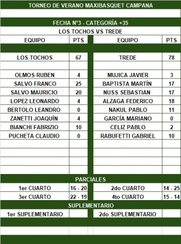 En su debut en el certamen (tuvo que postergar sus primeros 2 juegos) Trede venció 78-67 a Los Tochos, por la tercera fecha del Torneo de Maxibásquet +35 de Verano en Campana. Federico Álzaga (18) y Martín Baptista y Sebastián Nuss (ambos con 17 unidades) fueron los máximos anotadores de los de San Martín. Franco (25) y Mauricio Salvo (20) fueron los goleadores de los siderúrgicos.