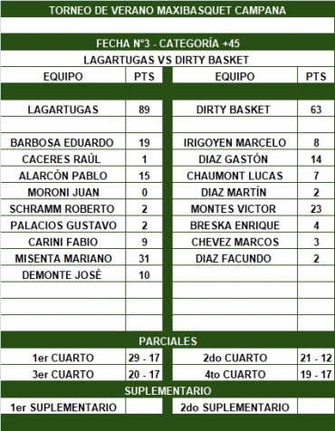 Lagartujas derrotó 89-63 a Dirty Basket, en juego correspondiente a la fecha 3 del Torneo de Maxibásquet +45 de Verano en Campana. Gran regreso de Mariano Misenta (31) en el vencedor. Gran noche de Eduardo "el Oveja" Barbosa (19) y Pablo Alarcón (15). En Dirty Víctor Montes (23) fue el destacado.