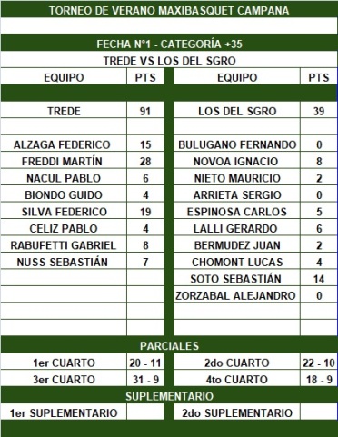 Trede venció 91-39 a Los del Sgro, en el recupero del juego postergado de la fecha 1 del Torneo de Maxibásquet +35 de Verano en Campana. Con 28 puntos Martín "el Chino" Freddi fue el ganador del ganador. Sebastián Soto (14) fue el mejor del perdedor.