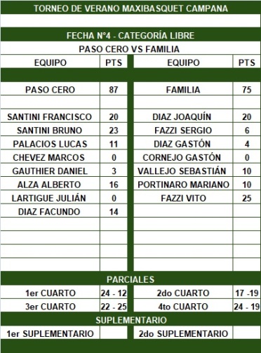 De la mano de Bruno (35) y Francisco (23) Santini, Paso Cero derrotó 87-75 a Familia. 86-59, por la fecha 4 del Torneo de Libres de Verano en Campana. Vito Fazzi (25) y Joaquín Díaz (23) sobresalieron en el perdedor.