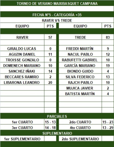 En en el cierre de la fase regular del Torneo de Maxibásquet +35 de Verano en Campana, Trede derrotó 83-57 a Raver, con una gran noche de Mariano García (19) y buenos desempeños del resto. Leandro Libarona (20) fue el goleador del Cardo y del partido.