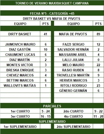 Siendo ampliamente superior Mafia de Pivots derrotó 89-41 a Dirty Basket, por la quinta fecha del Torneo de Maxibásquet +45 de Verano en Campana. Rodrigo Ritoli (23) y Mauro "el Oso" Melo (22) fueron los goleadores del máximo candidato al título. En Dirty el mejor fue Gastón Díaz (10)