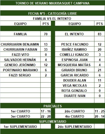 El Intento se impuso 83-70 a Familia y se adjudicó la fase regular del Torneo de Libres de Verano en Campana. Bruno Girardi (21) y Ramiro Ibañez (20) fueron los abanderados del gol en el Celeste. El Familia la rompió Fabián "el Churro" Churruarín (33).
