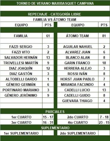 Tomándose revancha de la derrota sufrida en la primera presentación de ambos, Átomo Team derrotó 81-61 a Familia, en el repechaje para las semifinales del Torneo de Libres de Verano en Campana. Franco Garín (18) lideró a los Atómicos, secundado por Lucio Cadelli (13). El veterano Hernán Salvador (13) y Joaquín Díaz (12) sacaron pecho por el perdedor.