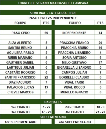Tomándose revancha del partido que disputaran en la fase regular, Independiente derrotó a Paso Cero por 74 a 65, y accedió a la final del Torneo de Libres de Verano en Campana. Franco Pracchia (29), Gustavo Melo (17) y Bruno Pracchia (16) conformaron el tridente ganador del Diablo. Francisco Santini (22) y Lucas Palacios (13) se destacaron la escuadra azul.