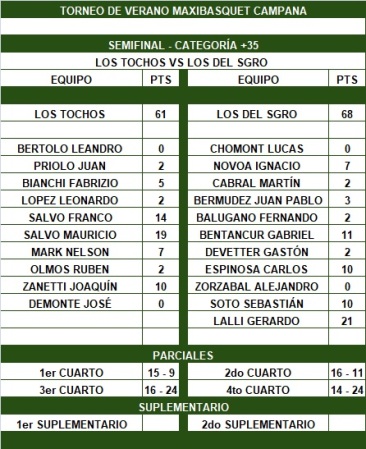 Remontando en el complemento una desventaja de 11 puntos, con Gerardo Lalli (21) encendido, Los del Sgro se llevó por 68-61 la semifinal del Torneo de Maxibásquet +35 de Verano en Campana ante Los Tochos. Los hermanos Mauricio (19) y Franco Salvo (14) redondearon un gran torneo, aunque no alcanzó para que los siderúrgicos alcanzaran la definición.