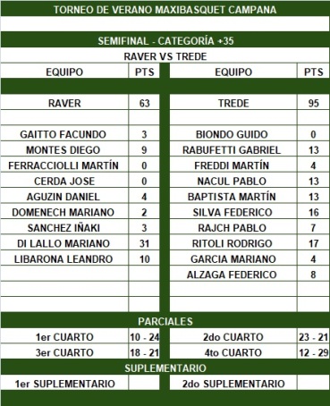 Por segundo año consecutivo Trede llegó a la final del Torneo de Maxibásquet +35 de Verano en Campana. Cinco jugadores puntuaron en doble dígito para el ganador, siendo Rodrigo Ritoli (17) el de mayor puntaje personal. Mariano Di Lallo (31) fue el goleador del juego y la figura del equipo de Cardales.