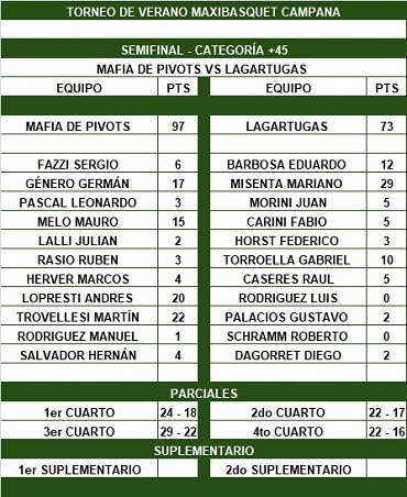 En lo que ya es un clásico de los veranos Mafia de Pivots derrotó 97-73 a Lagartugas y está en la definición del Torneo de Maxibásquet +45 de Verano en Campana. La dupla compuesta por Martín Trovellesi (22) y Andrés "Andy" Lopresti (20) quemó a distancia las redes del rival. Germán Género (17) contribuyó desde el poste bajo y Mauro Melo (15) fue una daga en la contra para el ganador. Mariano Misenta (29) mostró toda su vigencia, secundado por el aporte de Eduardo "el oveja" Barboza (12) y Gabriel Torroella (10) para Lagatugas, que ni con un buen abogado pudo escabullirse de la derrota.