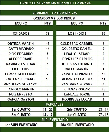 Tomándose revancha de lo acontecido en la fase regular (victoria negriblanca por 66-62), Oxidados venció a Los Indios por 78 a 69 y definirá el título del Torneo de Maxibásquet +45 de Verano en Campana ante Mafia de Pivots. Martín Ortega (16), Mariano Gatti (14) y Luciano Ortega (10) fueron los goleadores de un equipo que repartió los puntos en más manos que su rival, que dependió casi exclusivamente de lo que hicieron Oscar Chagas (2%), Fernando "el Indio" Zárate (15) y Claudio "el Gallo" Verardo (11).