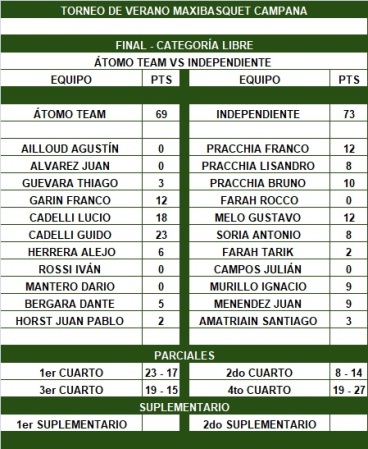 A regreso de la acción Átomo lució mejor de la mano de los hermanos Cadelli tomando todas las decisiones. Bruno Pracchia se hizo cargo del ataque Rojo y Juán Menéndez (9) luchó todos los rebotes, y con esos argumentos Independiente pudo recuperar terreno hasta quedar a 4 (50-46) a falta de 10 por jugar. Una bomba de Murillo y tres libres seguidos iniciaron la marea roja hacia el título. El trámite se inclinó claramente en favor del Diablo, manejado desde la base por Bruno Pracchia, que hizo jugar a su equipo. Átomo entró en desesperación. Franco Garín no pudo gravitar en la medida que lo hizo a lo largo del certamen, y dependió de las guapeadas de Guido Cadelli para sostener sus aspiraciones al campeonato. Pero no alcanzó. En los últimos 2 minutos Átomo falló 6 libres que fueron determinantes. En cambio el Rojo fue efectivo cuando le tocó ir a la línea de los suspiros, desde la que supo cerrar el juego para coronarse como el primer campeón del torneo de verano de Campana en la categoría libres.